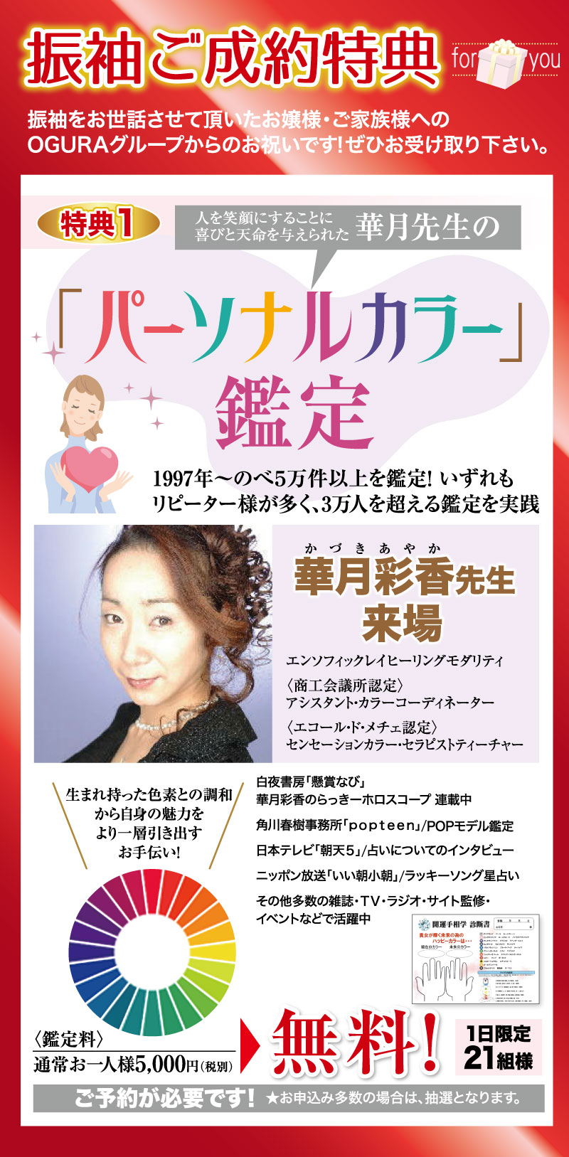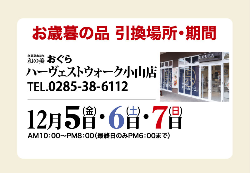 お歳暮プレゼント祭32025年10月8日 お歳暮プレゼント祭 お名前 必須 ふりがな ご住所 必須 ご連絡のつきやすい電話番号 必須 メールアドレス ※ご入力されたメールアドレスにご入力情報メールが配信されます。 ご希望店舗 必須※場合により日時の再調整をお願いする場合がございます。予めご了承ください。 ---【ハーヴェストウォーク小山店】12月5日(金)【ハーヴェストウォーク小山店】12月6日(土)【ハーヴェストウォーク小山店】12月7日(日) 来場ご希望時間(時)必須 ---10時11時12時13時14時15時16時17時18時19時 お歳暮の品プレゼント(必須)A〜Fよりお好きなものをおひとつお選びください。 A ローズポークB 干物詰合せC 蓬莱の豚まんD 辛子明太子E 有田みかんF ストレートバーム 振袖ご成約特典(任意) 特典1 パーソナルカラー鑑定の予約 するしない 予約される方は お名前: お名前: 特典2 ファーストきものプレゼント 特典3 ファーストジュエリープレゼント ※特典2・特典3、いずれかお選びください。 ※きもののお仕立て、ジュエリーの加工は当店にて承ります。 特典4 きものメンテナンス 特典5 ジュエリーメンテナンス お問い合わせ連絡事項がある場合はご記載ください ■和の美おぐら 店舗一覧 和の美おぐら 古河店 茨城県古河市下辺見2140-3 電話番号:0280-32-2321 営業時間:10:00~19:00定休日:月曜日〈祝日は営業〉 和の美おぐらイオンモール下妻店 茨城県下妻市堀籠 972-1 イオンモール下妻 2F 電話番号:0296-30-6171 営業時間:10:00~21:00定休日:なし 和の美おぐらイオンモール上尾店 埼玉県上尾市愛宕3丁目8番1号 イオンモール上尾 2F 電話番号:048-783-5092 営業時間:10:00~21:00定休日:なし 和の美おぐらアリオ鷲宮店 埼玉県久喜市久本寺谷田7-1 アリオ鷲宮 2F 電話番号:0480-53-5800 営業時間:10:00~21:00定休日:なし 風のスタジオ Le Lien川越 ウニクス南古谷店 埼玉県川越市泉町3-1 ウニクス南古谷店 2F 電話番号:049-293-5991 営業時間:10:00~19:00定休日:火曜日〈祝日は営業〉 和の美おぐらハーヴェストウォーク小山店 栃木県小山市喜沢1475 おやまゆうえんハーヴェストウォーク 電話番号:0285-38-6112 営業時間:10:00~20:00定休日:なし 風のスタジオ CORO イオンタウン真岡店 栃木県真岡市台町2668 イオンタウン真岡店 電話番号:0285-81-6960 営業時間:9:00~18:00定休日:火曜日(祝日は営業) 和の美おぐら ベルモール宇都宮 栃木県宇都宮市陽東6-2-1 ベルモール宇都宮店 2F 電話番号:090-1668-7560 営業時間:10:00~21:00定休日:なし 和の美おぐらインターパーク宇都宮店 栃木県宇都宮市インターパーク4-1-3 インターパークショッピングビレッジ 電話番号:028-688-7412 営業時間:10:00~20:00定休日:なし カテゴリ:ハーヴェストウォーク小山店