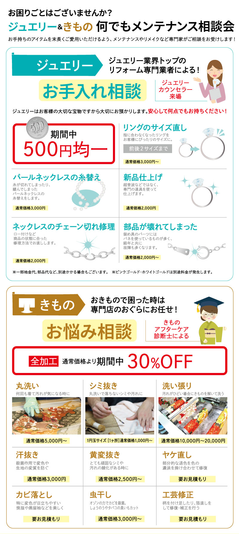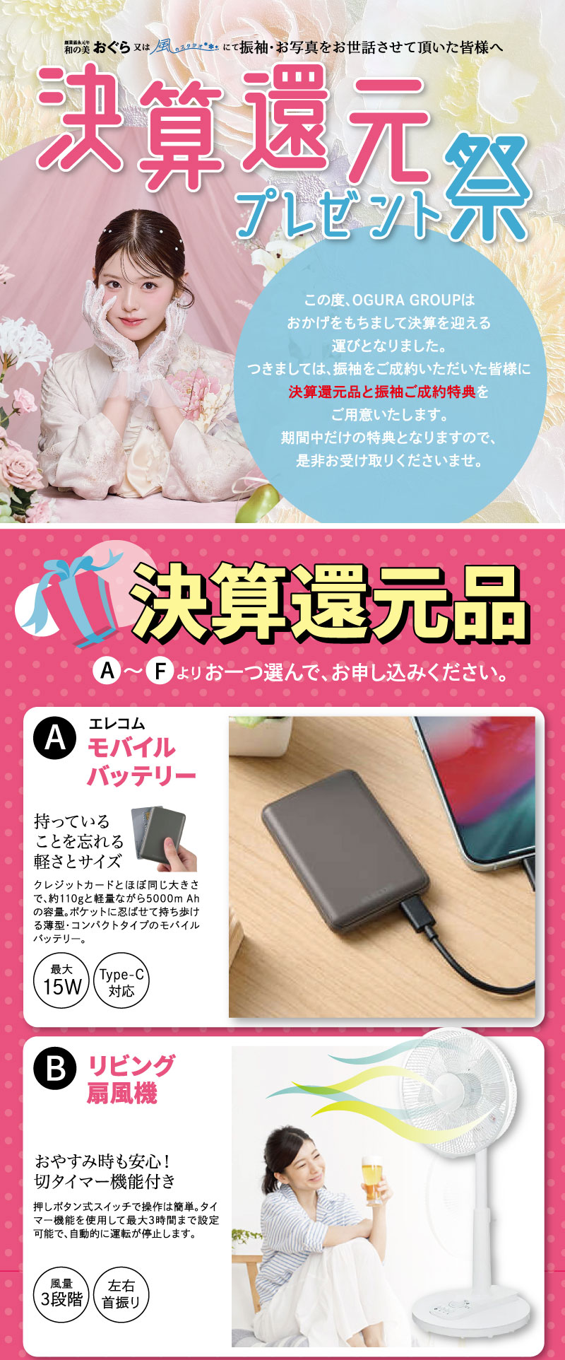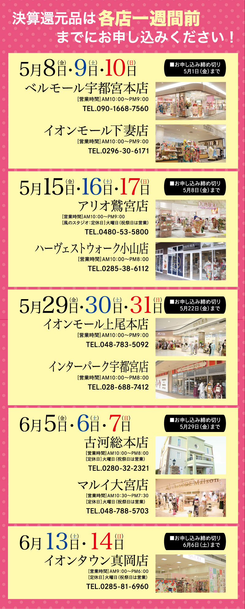 振袖決算20262026年4月6日 決算還元プレゼント祭 お名前 必須 ふりがな ご住所 必須 ご連絡のつきやすい電話番号 必須 メールアドレス ※ご入力されたメールアドレスにご入力情報メールが配信されます。 ご希望店舗 必須※場合により日時の再調整をお願いする場合がございます。予めご了承ください。 ---ベルモール宇都宮本店(5月8日(金))ベルモール宇都宮本店(5月9日(土))ベルモール宇都宮本店(5月10日(日))イオンモール下妻(5月8日(金))イオンモール下妻(5月9日(土))イオンモール下妻(5月10日(日))アリオ鷲宮店(5月15日(金))アリオ鷲宮店(5月16日(土))アリオ鷲宮店(5月17日(日))ハーヴェストウォーク小山店(5月15日(金))ハーヴェストウォーク小山店(5月16日(土))ハーヴェストウォーク小山店(5月17日(日))イオンモール上尾本店(5月29日(金))イオンモール上尾本店(5月30日(土))イオンモール上尾本店(5月31日(日))インターパーク宇都宮店(5月29日(金))インターパーク宇都宮店(5月30日(土))インターパーク宇都宮店(5月31日(日))古河総本店(6月5日(金))古河総本店(6月6日(土))古河総本店(6月7日(日))マルイ大宮店(6月5日(金))マルイ大宮店(6月6日(土))マルイ大宮店(6月7日(日))イオンタウン真岡店(6月13日(土))イオンタウン真岡店(6月14日(日)) 来場ご希望時間(時)必須 ---10:0011:0012:0013:0014:0015:0016:0017:0018:0019:00 ご希望の決算還元品(必須)A〜Fよりお好きなものをお一つお選びください。 A.モバイルバッテリーB.リビング扇風機C.マイナスイオン2WAYアイロンD.体組成計E.アイラッシュカーラーF.オーブントースター 振袖ご成約2大特典のご予約(任意)いずれかお選びください。 特典1.ジュリープレゼント特典2.きものプレゼント 何でもメンテナンス相談のご予約(任意) ジュエリーお手入れ相談きものお悩み相談 お問い合わせ連絡事項がある場合はご記載ください ■和の美おぐら 店舗一覧 和の美おぐら 古河店 茨城県古河市下辺見2140-3 電話番号:0280-32-2321 営業時間:10:00~20:00定休日:火曜日〈祝日は営業〉 和の美おぐらイオンモール下妻店 茨城県下妻市堀籠 972-1 イオンモール下妻 2F 電話番号:0296-30-6171 営業時間:10:00~21:00定休日:なし 和の美おぐらイオンモール上尾店 埼玉県上尾市愛宕3丁目8番1号 イオンモール上尾 2F 電話番号:048-783-5092 営業時間:10:00~21:00定休日:なし 和の美おぐらアリオ鷲宮店 埼玉県久喜市久本寺谷田7-1 アリオ鷲宮 2F 電話番号:0480-53-5800 営業時間:10:00~21:00定休日:なし 風のスタジオ Le Lien川越 ウニクス南古谷店 埼玉県川越市泉町3-1 ウニクス南古谷店 2F 電話番号:049-293-5991 営業時間:10:00~19:00定休日:火曜日〈祝日は営業〉 和の美おぐらハーヴェストウォーク小山店 栃木県小山市喜沢1475 おやまゆうえんハーヴェストウォーク 電話番号:0285-38-6112 営業時間:10:00~20:00定休日:なし 風のスタジオ CORO イオンタウン真岡店 栃木県真岡市台町2668 イオンタウン真岡店 電話番号:0285-81-6960 営業時間:9:00~18:00定休日:火曜日(祝日は営業) 和の美おぐら ベルモール宇都宮 栃木県宇都宮市陽東6-2-1 ベルモール宇都宮店 2F 電話番号:090-1668-7560 営業時間:10:00~21:00定休日:なし 和の美おぐらインターパーク宇都宮店 栃木県宇都宮市インターパーク4-1-3 インターパークショッピングビレッジ 電話番号:028-688-7412 営業時間:10:00~20:00定休日:なし カテゴリ:アリオ鷲宮店/イオンモール上尾店/イオンモール下妻店/インターパーク宇都宮店/ハーヴェストウォーク小山店/ベルモール宇都宮店/催事のご案内/古河店